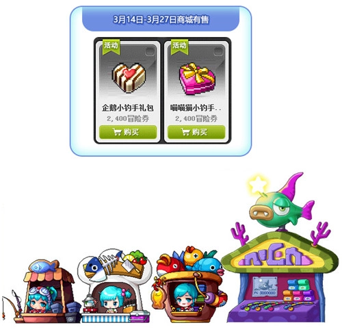 活动二:活动期间,使用高级鱼饵罐头垂钓,就有机会钓起白色情人节特供精品!
