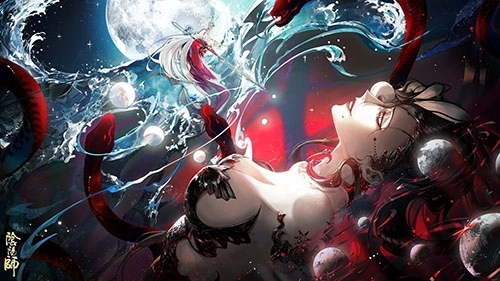 蛇魔低首嘶鸣,两三只幽蝶悬停振翅,虚无的哀歌伴着蝶语回荡,翅纹间映出寰宇的幽光。