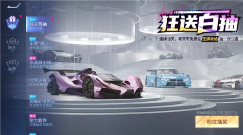 7月7日至9月1日活动期间,车手首次登录游戏将触发“狂送百抽”活动。自触发当日起,连续10天,每天可在王牌补给(新车UP卡池)享受一次免费十连抽,补给积分会正常累计!7月5日起,王牌补给的UP车辆将更新为全新幻想神车——星穹幻音,这是首台自带BGM的幻想神车,车手们可别错过!