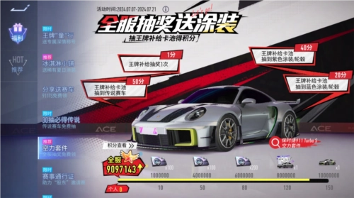 担心你错过百抽活动,特意用全新改装套件来提醒你。7月7日至7月21日期间,在王牌补给卡池参与抽奖就能获取个人积分,当全服累计积分达到规定数额时,大家就能免费领取全新空力套件——街霸啦!