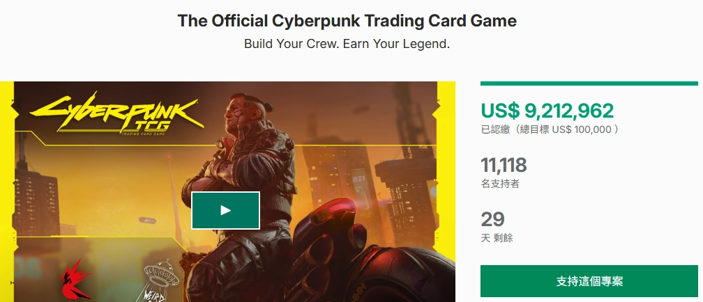 由CDPR官方授权监制,基于《赛博朋克2077》游戏及动画版改编的衍生卡牌游戏《Cyberpunk Trading Card Game》日前正式开启众筹。该项目仅用5分钟便达成10万美元的众筹目标,截止本文发稿时,短短一天内已获得高达920万美元的资金支持。