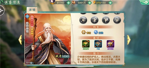 慈悲神僧被誉为“治疗核心侠客”,能显著增强团队的生存能力。作为功能性侠客,他是强力辅助,可实现全体回血并清除目标的增益效果,堪称爆发类阵容的天敌!当慈悲神僧开启觉醒后,会获得让敌方伤害最高的两名侠客下次攻击伤害降低10%的效果,与此同时还会解锁额外的招式和心法,并且将招式心法带来的治疗效果提升10%,为己方拳掌类侠客增加20%的减伤效果,从而能更好地守护团队。