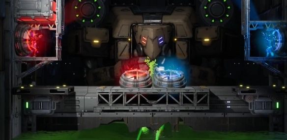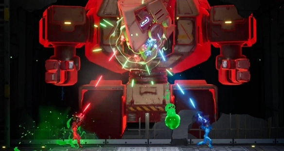 使用和胶囊颜色一致的角色进行射击就能把它破坏掉,得注意动作一定要迅速,不然很容易被不断前进的BOSS撞到。