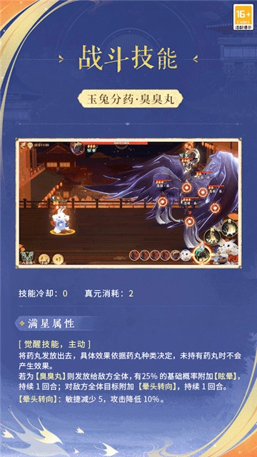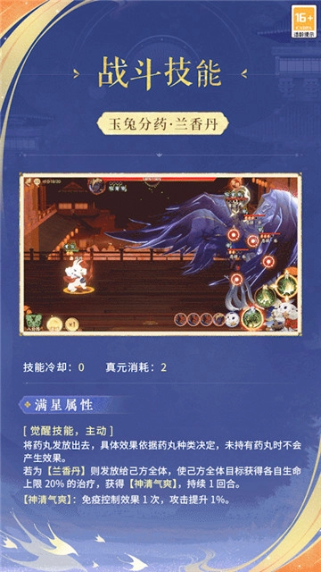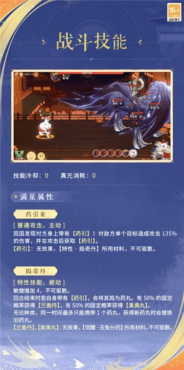因因在战斗中担任辅助角色!它的普攻是技能【药引来】,特性技能为【捣奇丹】,觉醒技能则是【玉兔分药】,因因捣药,能让人神清气爽!