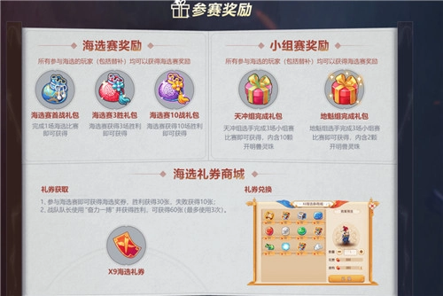 在海选赛阶段,所有参赛玩家(含替补玩家)完成首场战斗、取得三场胜利、达成十场胜利时,将依次获得首战礼包、3胜礼包与10战礼包。另外,玩家每参与一轮海选赛,系统会依据该场战斗的胜负情况发放数量不同的海选礼券:战斗胜利可获得30张X9海选礼券,失败则获得10张X9海选礼券。海选礼券可用于兑换高级藏宝图、金钥匙、星辰晶石等丰厚奖励!