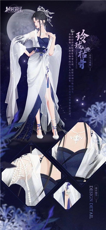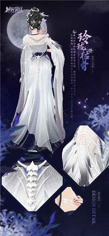 官方也留意到了玩家们的诉求,于是在近期推出了白夫人的同款戏服【玲珑枯骨】!在《烂片的诞生》里,那位美艳的反派角色白夫人,其原型是一具白骨,而以白夫人戏服为设计灵感的裙装,也与她的原型同名,裙袂轻盈飘动,身姿窈窕如同浮云般曼妙。