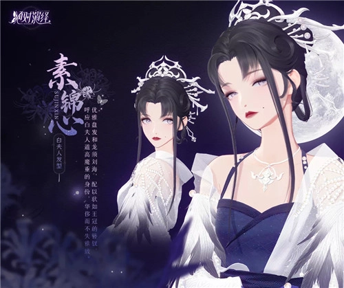 与戏服同步推出的,还有与之配套的发型【锦素心】。优雅的盘发凸显出清冷的气质,充满古装韵味的龙须刘海随风轻扬,让人很容易联想到白夫人翱翔天地间的轻盈身影。而点缀在乌黑发丝间、精致华美的纯白发簪,既暗示了白夫人身为白骨的身份,也彰显了她高强的法力。