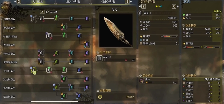 当收集到足够的骨头后,就能打造一把骨刃作为初期的开荒武器。这把武器自带集中技能,对于大剑来说是相当合适的选择。