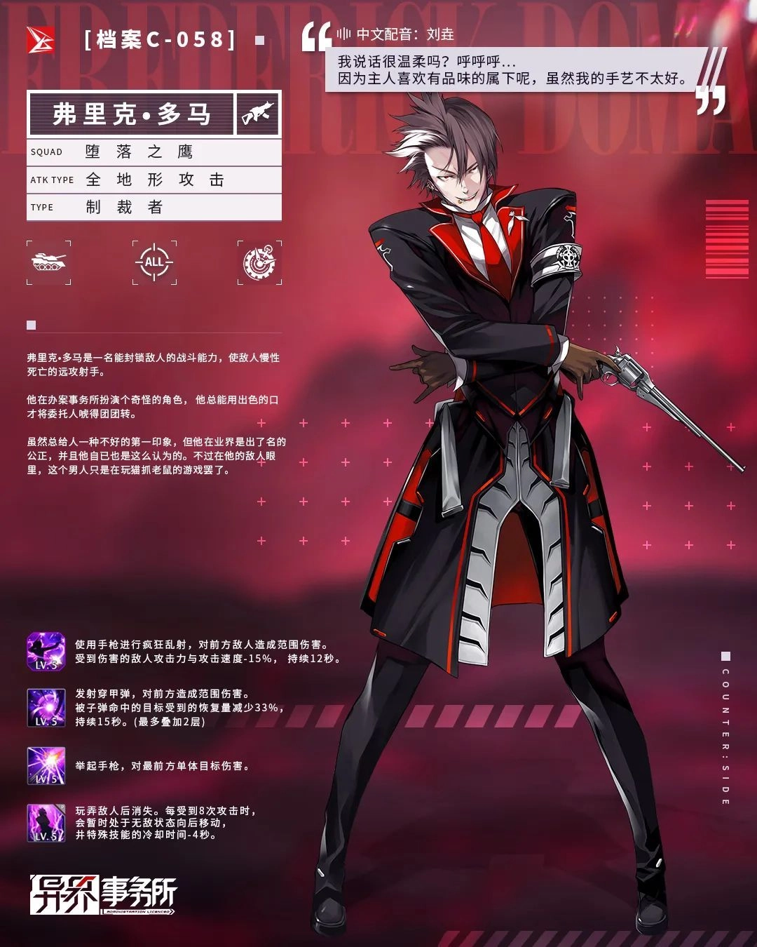 弗里克多马是游戏《异界事务所》里的3费制裁者突击队员,凭借被动技能带来的受击无敌后退效果调整站位,以此提升自身的生存能力;同时,他能通过特殊技能与奥义,给敌人施加减疗、增伤(此处增伤应为对我方攻击该目标时的增伤,即目标受到伤害增加)、攻击力下降、攻击速度减缓等多种负面状态,在持续削弱敌人以减轻队伍生存压力的同时,还拥有一定的团队增伤辅助能力。
