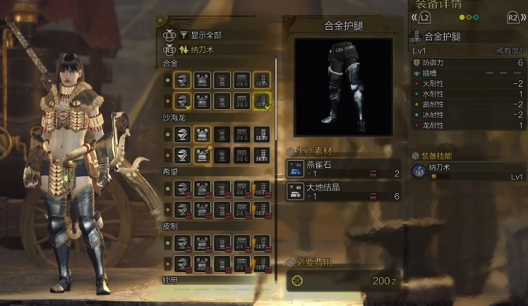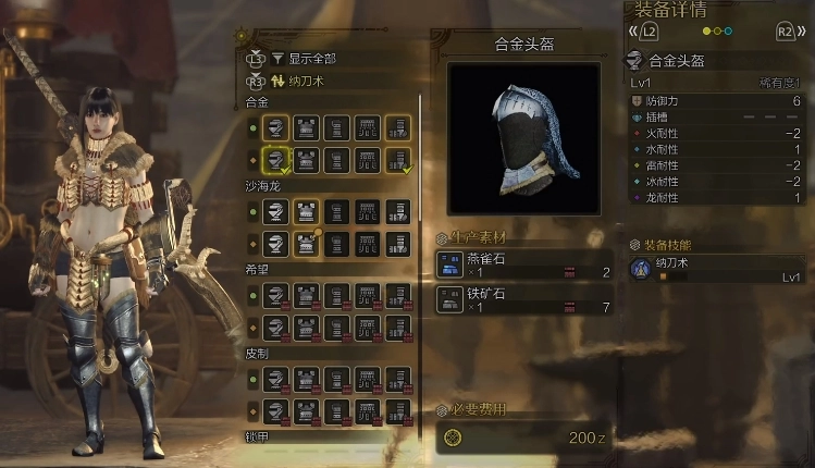 在还不能打护石的时候,可以依靠装备技能来提升;其中合金头盔、合金护腿以及沙海龙盔甲都能提供纳刀术技能。