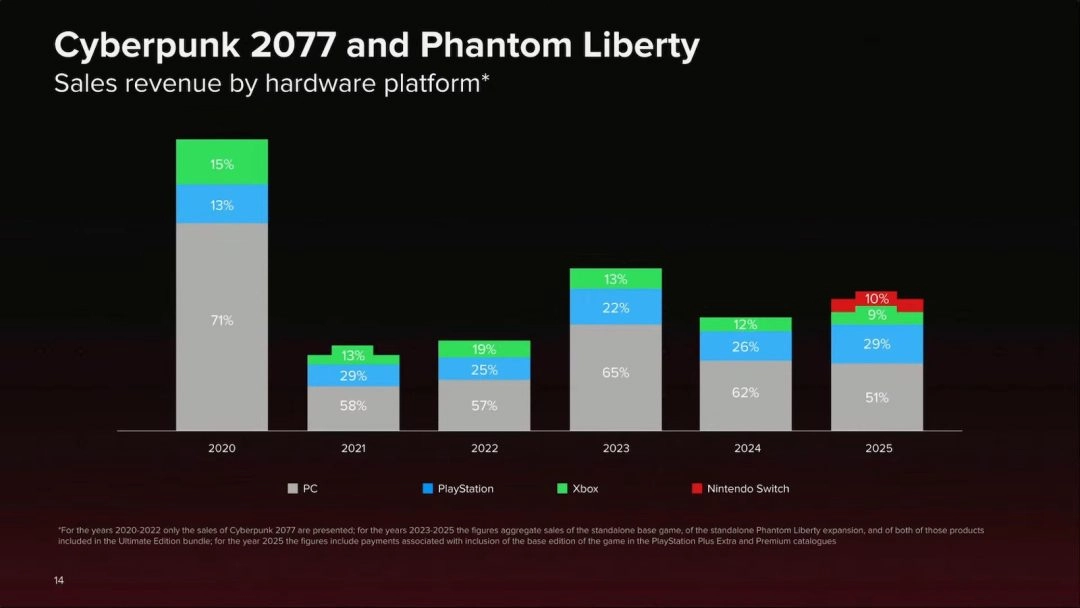 其中的重要IP《赛博朋克2077》在PC平台的表现遥遥领先,占比达51%;而近年来备受关注的任天堂平台表现同样亮眼,占比甚至略高于XBOX平台,达到10%。