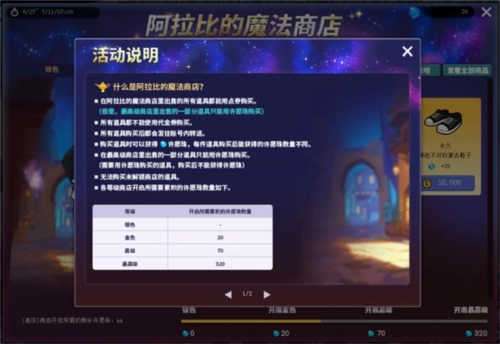 阿拉比商店内的道具可使用点券进行购买。(最高级商店中部分出售的道具仅能通过许愿珠购买)道具购买后将绑定至账号。购买道具时能够获得许愿珠。未解锁的商店中的道具无法进行购买。