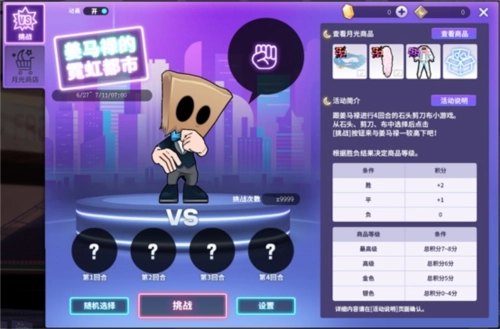 与姜马禄开展4个回合的石头剪刀布小游戏。点击【设置】按钮确定4个回合的石头剪刀布选择后,再点击【挑战】按钮向姜马禄发起挑战。每次挑战需消耗1个【闪耀的原石】,该道具可在活动页面获取或前往商城购买。