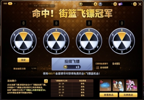 投掷飞镖前,可将其中1个飞镖盘的数字固定为6。投掷时,这个固定数字的飞镖盘显示6,另外3个飞镖盘的数字随机生成。固定数字有助于更轻松地拿到高分,不过相应的费用也会增加!消耗495个金星硬币后,能获得一次4个飞镖盘数字全为6的机会,并且可以免费投掷一次。除固定数字的飞镖盘外,其余每个飞镖盘都有1/6的概率随机出现1到6中的某个数字。最终将根据4个飞镖盘显示数字的总和来确定商品等级。