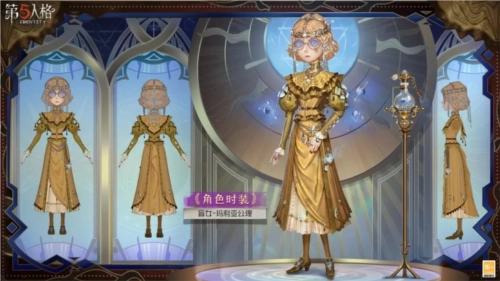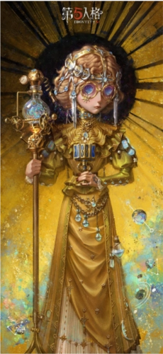 时装海报里,盲女-玛利亚公理身着一袭金色连衣裙,身后的黑色圆环正是她失去光明后眼中的世界,不过在这片黑暗里却闪烁着点点流萤般的彩光。她的四周也满是金色萦绕,失去的那片光明并未阻碍她收获更多美好。她神情专注而冷静,微微侧头仿佛在聆听,右手紧握着正在冶炼的仪器,左手则握着日晷密钥,周身的矿石和悬挂的蒸馏瓶都在诉说她对炼金术的热爱。