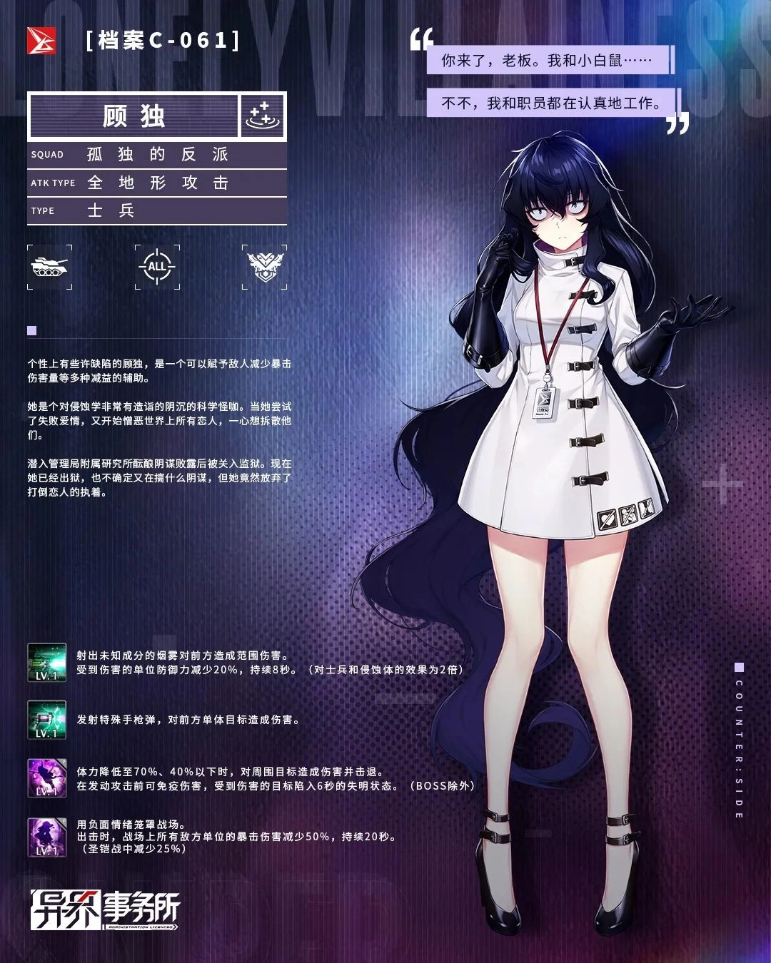 顾独是游戏《异界事务所》里的三费士兵辅助角色,她在入场时能提供高额的一次性降低暴击伤害的DEBUFF,借助特殊技可以反复施加巨额的减防与减攻速DEBUFF,而其强大的低血量自动反击并后退调整位置的锁血被动,也能出色地保障自身生存,让她得以持续站场,为全队提供大量DEBUFF效果。