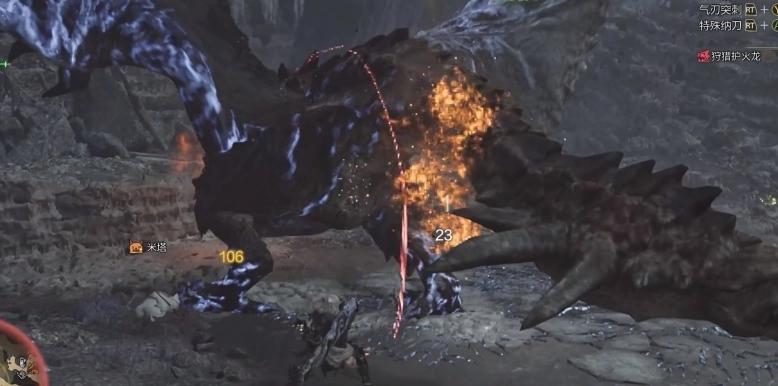 使用这招之前,护火龙的嘴里会清晰地冒出火星,并且会有一个站立低头的前摇动作,这个前摇的时间比较长,我们可以直接移动到它头部的侧面继续发起攻击。