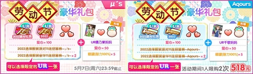 活动期间会推出5款礼包,其中【劳动节豪华礼包〜μ's〜518元】和【劳动节豪华礼包〜Aqours〜518元】限购2次;【劳动节纪念礼包188元】、【劳动节爱心礼包128元】以及【劳动节迷你礼包25元】限购4次。