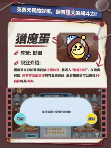好蛋阵营新增职业“猎魔蛋”:若猎魔蛋在讨论环节被投票出局,将触发“猎魔时刻”——此时所有存活蛋仔都能参与讨论,猎魔蛋则可结合场上信息,自由挑选1名目标并将其淘汰!