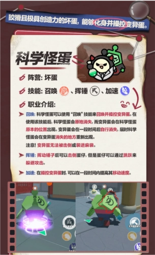 坏蛋阵营新增职业“科学怪蛋”:此职业可召唤并操控变异蛋。施展召唤技能后,科学怪蛋会在原地消失,同时出现一只变异蛋。变异蛋既不能被击倒,也无法被装进麻袋,并且具备挥锤击倒蛋仔的能力以及加速技能。科学怪蛋能够操控变异蛋进行行动,直到过了一段时间,变异蛋自行消失,科学怪蛋便会重新出现在变异蛋消失的位置。