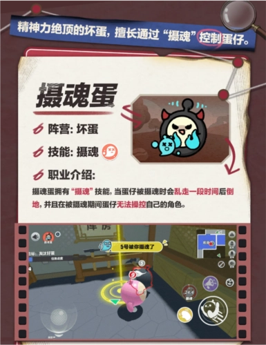 坏蛋阵营新增了一个名为“摄魂蛋”的职业,它掌握着“摄魂”这一特殊技能。当摄魂蛋靠近其他蛋仔并施展摄魂技能时,被施加技能的蛋仔会失去对自身角色的掌控,不受控制地四处乱走,过一会儿就会倒地不起。摄魂蛋可以利用这段时间提前离开现场,伪造出自己不在场的证据,以此洗清作案的嫌疑,顺利从危险的处境中脱身。