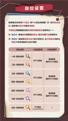 隐藏与伪装的博弈,推理与解密的较量,巅峰对决中谁能登顶造极?5月31日起,“揪出捣蛋鬼”巅峰模式震撼开启!只需完成3场进阶模式即可解锁,传奇侦探的成长之路由此启程,全新的荣誉篇章等待你来书写!巅峰模式采用单人挑战形式,共设置7个段位,以“星”作为段位升级的依据——每积累25积分就能提升1星,而不同段位的积分将根据蛋仔的游戏胜负情况与表现得分综合结算。蛋仔的每一次成绩都将被纳入排行榜,直至当季派对结束,所有段位自动清零,全体侦探将重回起点,再次向传奇之名发起冲击!