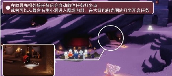 1、在向导先祖处接取任务后,会自动前往任务打坐点;玩家也可从舞台右侧的小洞进入剧场内部,在大背包前的光圈处打坐来开启任务。