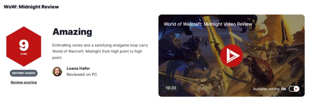 目前IGN为《魔兽世界:至暗之夜》给出了9分的好评,评价道:其引人入胜的区域设计与令人满意的终局循环机制,让这款游戏能够不断从一个高潮迈向另一个高潮。