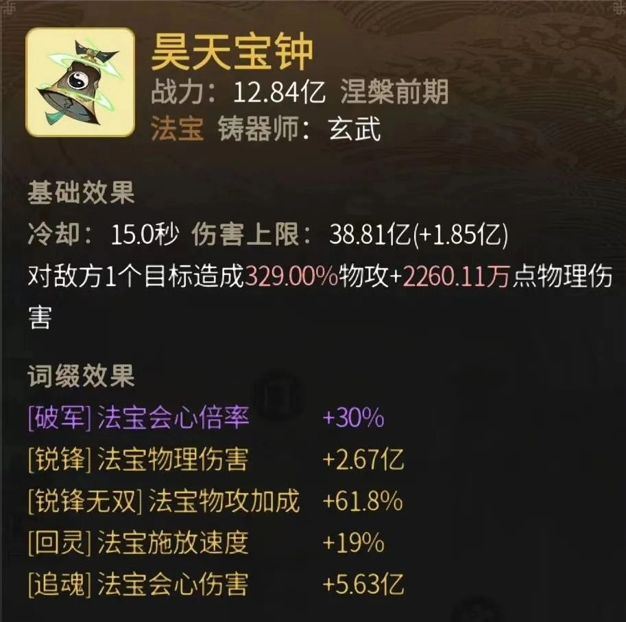 双锐锋搭配回灵的组合,锐锋负责提供基础伤害,锐锋无双则带来基础物攻加成。提升体修法宝伤害最显著的两个词缀在此齐聚,而且都是金色品质,这使得这口钟的基础伤害(不计增减伤)会比普通的钟天然高出5亿以上。涅槃境界的法宝大多难以打满伤害,因此这两条增伤词缀的效果堪称出色。