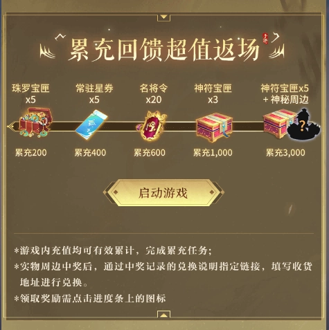 累充福利已上线,惊喜好礼等你解锁!活动期间,只要累计充值达到指定金额,就能在活动页面领取对应的奖励!充值可获得珠罗宝匣、常驻星卷、名将令、神符宝匣等丰富好礼,当累充金额达到3000元时,除了能拿到5个神符宝匣,还有神秘周边相赠!