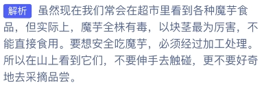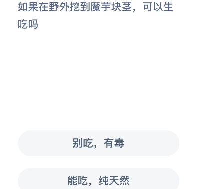 本次为大家带来的是蚂蚁庄园8月11日的庄园小课堂问题,这次的小问题和我们日常食用的魔芋有关。不过,要是在野外挖到了魔芋块茎,能不能直接生吃呢?