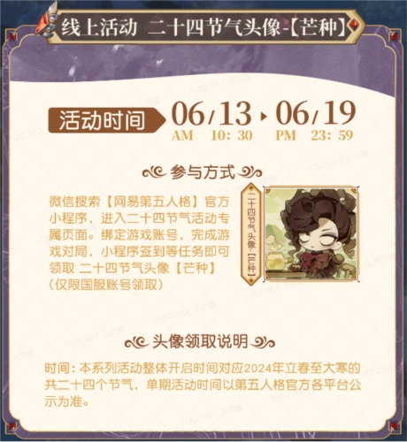 此外,芒种线上活动将于6月13日至6月19日期间,在“网易第五人格”官方小程序的二十四节气活动专属页面进行。绑定游戏账号的玩家完成相关活动任务后,就能领取二十四节气头像-【芒种】。这款头像呈现的是歌剧演员身处环山庭院,静听雨声、以清水煮茶,悠然享受午后惬意时光的画面。