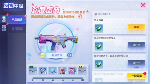 完成任务累计盛典积分,即可领取“战术冲锋枪-碧蓝之海”皮肤等丰厚奖励!国庆假期(10月1日至10月7日)期间完成任务,还能获得3倍盛典积分哦!