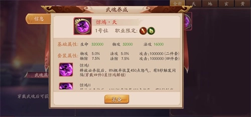 开启武魂系统的条件是主角等级达到105级。系统开启后,每位武将都拥有天地玄黄四个武魂位,可佩戴对应位置的武魂。不同武魂对武将职业有特定限制,只有武将职业符合武魂要求才能佩戴。当武将佩戴同套武魂达到两件时,将激活套装属性;若达到四件,则不仅能激活套装属性,还会赋予武将全新的作战特性,让武将在战场上的表现更出色。