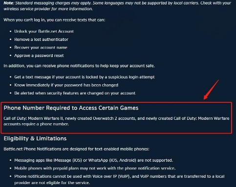 在战网的电话通知支持页面中,暴雪说明《守望先锋:归来》、《使命召唤:现代战争2》以及新注册的《使命召唤:现代战争》账号,都必须绑定电话号码方可进行游戏,同时明确这些账号均不支持预付费电话。
