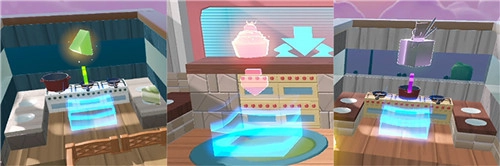 场地内配备了三个料理台,每个料理台都有其固定的蛋糕口味制作权限。蛋仔需要把食材运送到料理台所在区域,一旦凑齐1袋面粉和1份与蛋糕口味匹配的原材料(比如抹茶粉、巧克力或者奶油),料理台就会启动自动制作程序,稍等一会儿,新鲜的蛋糕就做好了。