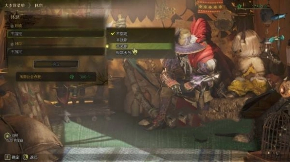 3、进入营地后选择休息,通过调整天气与时间,使怪物出现。