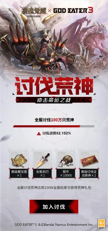 经过全服游骑兵们半个月的不懈努力,全服讨伐荒神活动距离100万只的目标进度已突破80%,丰厚的荒神礼包与随机噬神者3联动猎魂大奖正逐步靠近,和AGE们一同向着最终胜利进发吧!