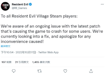致所有《生化危机8》Steam平台的玩家: 我们留意到最新发布的补丁出现了问题,致使部分用户在游戏过程中遭遇崩溃情况。目前我们正全力研究解决方案,对于此事给大家带来的任何困扰,我们致以诚挚的歉意!