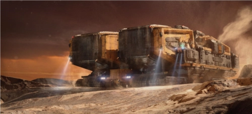 在游戏的最后一个界面中,在遥远的艾格勒姆星系,我们可以看到一艘登陆船样式的舰船从山坡上缓缓开出。