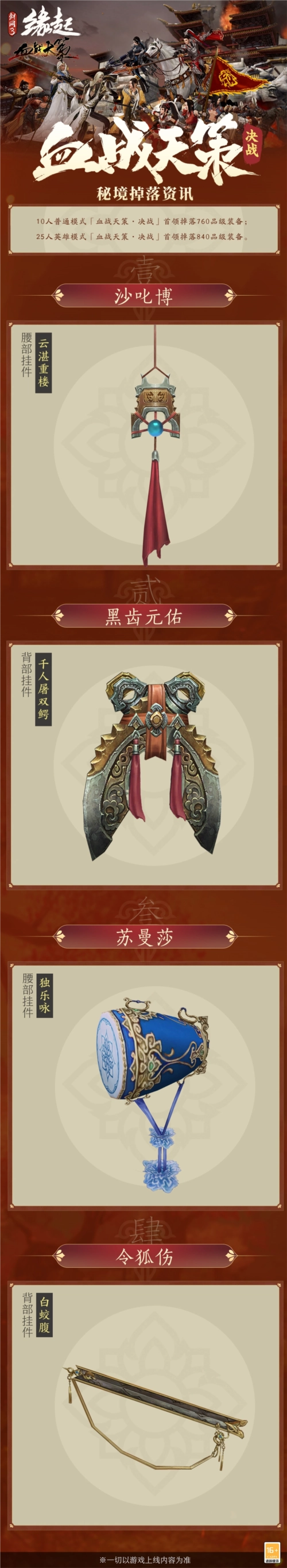 稀世神兵将在25人英雄难度「血战天策·决战」五甲诞生后的首个维护日开放。记不住的侠士可以保存下方图片,以便日后查看。