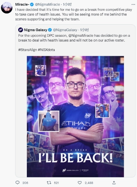 刚刚,《DOTA2》职业战队Nigma通过官方推特发布消息,宣布队内Carry选手Miracle因健康问题决定暂作休整,不再以活跃选手身份随队参赛。随后Miracle转发了该消息,再次说明自己因健康原因不得不暂时离开赛场,但粉丝仍能看到他在幕后为Nigma团队提供支持。