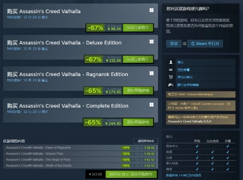 《刺客信条:英灵殿》已在Steam平台正式发售,国区标准版定价298元,目前正开展发售特惠活动:标准版折后价98.34元,相当于原价基础上减免67%;豪华版折后价131.34元,同样享受67%的折扣;完全版折后价244元,折扣力度为65%。本次促销活动将持续至12月23日。
