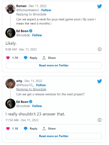 最近有粉丝询问新作是否会在未来六个月内公布,开发商负责人回应“有可能”;在另一条推文里,他还透露这款游戏预计2023年发售,并且会是系列中持续更新周期最长的作品。