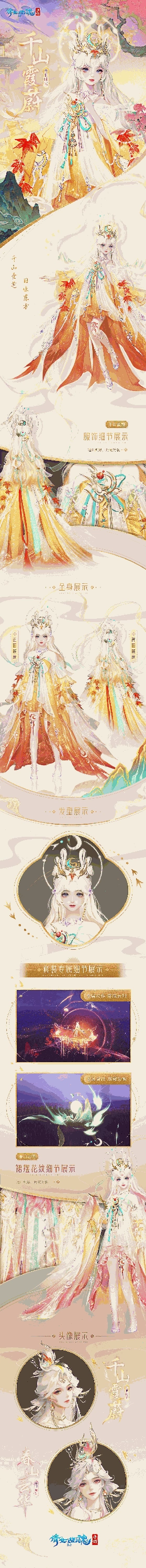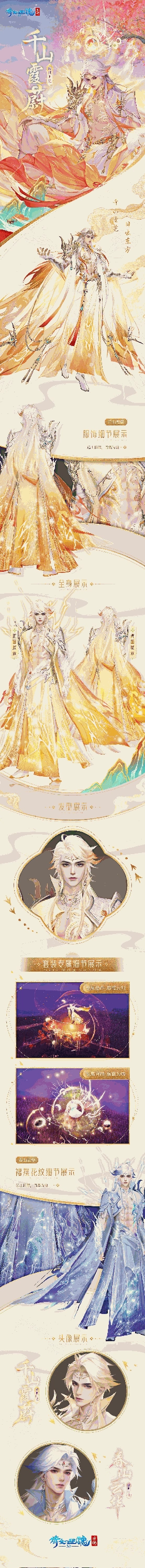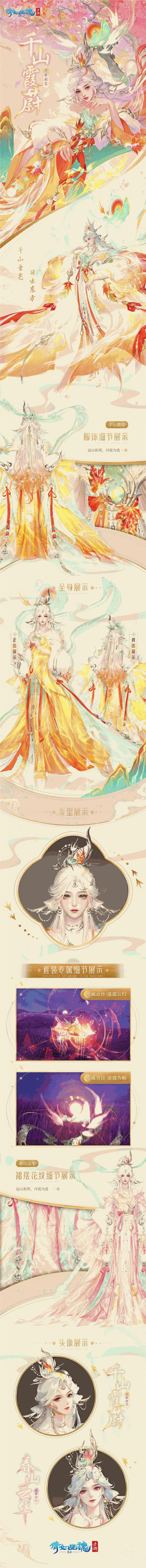 【千山霞蔚】成女款的设计灵感源自落霞群山中身披彩霞的神女形象:那由霞光织就的金色华裳,在万籁俱寂中更显璀璨;神女的银色渐变长发随风轻扬,冷艳中透着神秘气息。其前胸设计以国画里的层叠群山为灵感,融合新中式美学,借古代瓷瓶的流畅线条勾勒轮廓,将东方神话中典雅神女的形象生动还原。