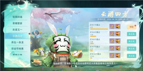 活动期间前往大禹村广场、龙井茶庄和落神渊,通过查看大屏幕获取每日推荐景点,前往景点完成打卡即可获得饱满麦粒和丰厚金币!