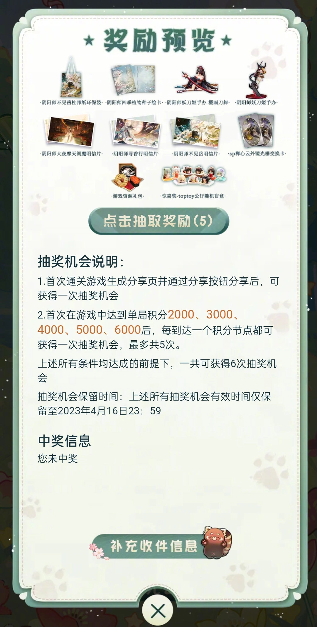 参与活动并分享,就能收获小熊猫的科普知识;首次通关后分享,还能额外获得1次【抽奖机会】;在活动挑战里,首次达到特定守护值时,也可获得1次抽奖机会,最多能获得5次。