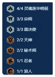 4明昼、3宗师、4裁决使、2天神、2秘术师、1忍者、1浪人
