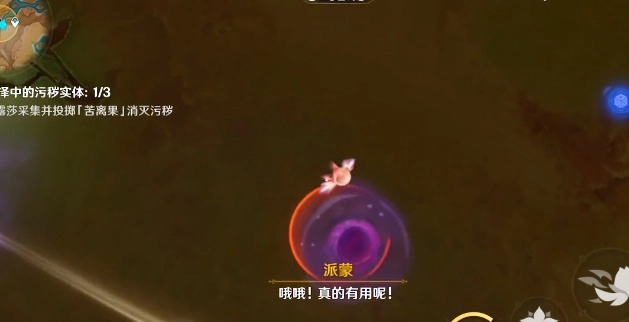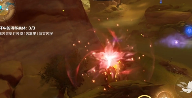 1、玩家需借助斯露莎采集并投掷苦离果,以清除沼泽中的污秽实体,第一步要先使用花技能来采集苦离果;
