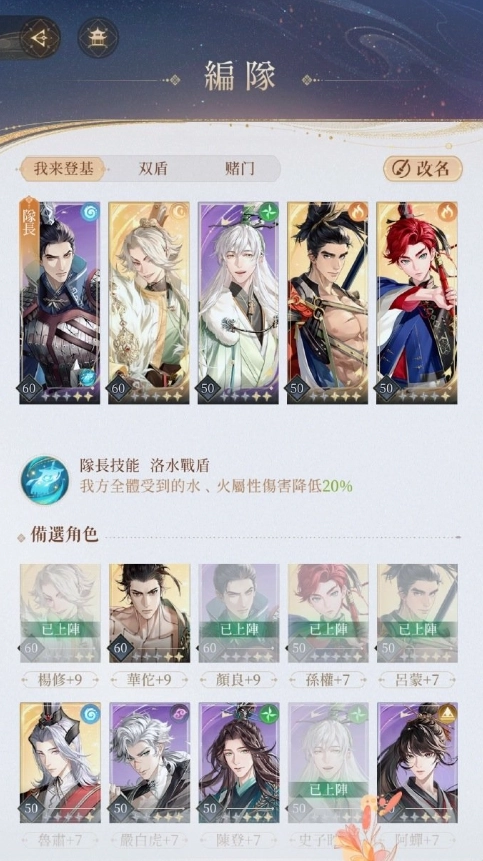 1、颜良,杨修(开局+2,技能提升),狮子喵(使用技能时防御),吕蒙(两星),孙权(防御时嘲讽,防御时回血/防御时叠盾)。